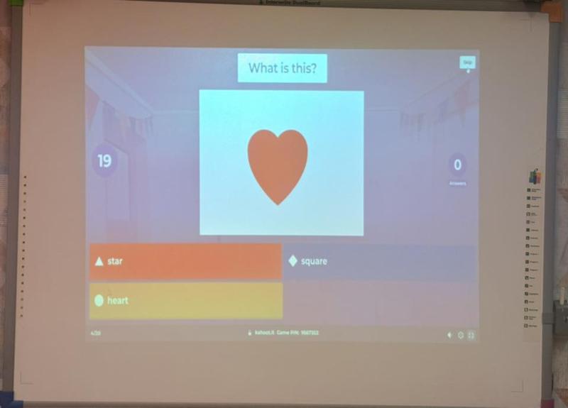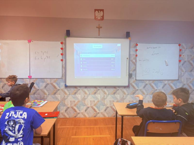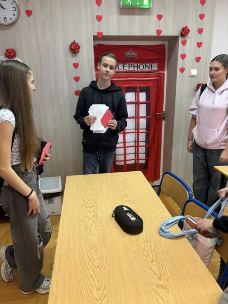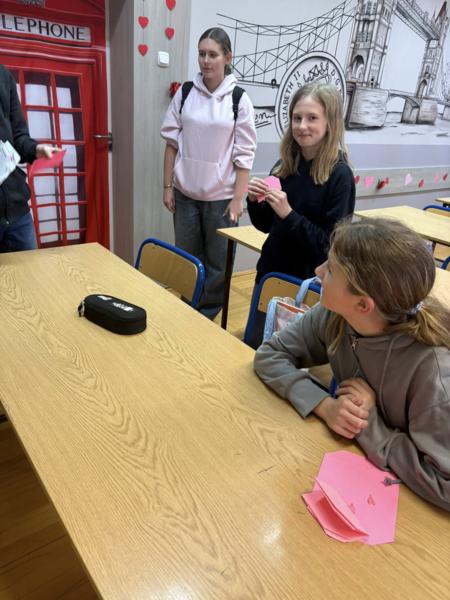 Nauka przez zabawę: Nawet na lekcjach królowały serca! Na zajęciach z języka angielskiego uczniowie mierzyli się w walentynkowych quizach Kahoot, szlifując słownictwo w miłosnym klimacie.