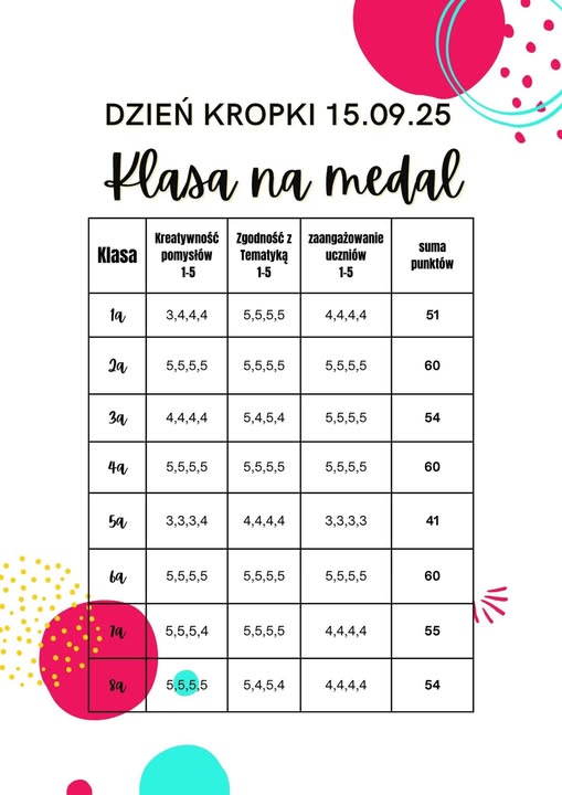 15 września świętowaliśmy w naszej szkole Międzynarodowy Dzień Kropki – dzień kreatywności, odwagi i odkrywania talentów. W ramach tego wydarzenia rozpoczęliśmy całoroczną akcję „Klasa na medal”, której celem jest wspólna zabawa, współpraca i rozwijanie pomysłowości wśród uczniów.